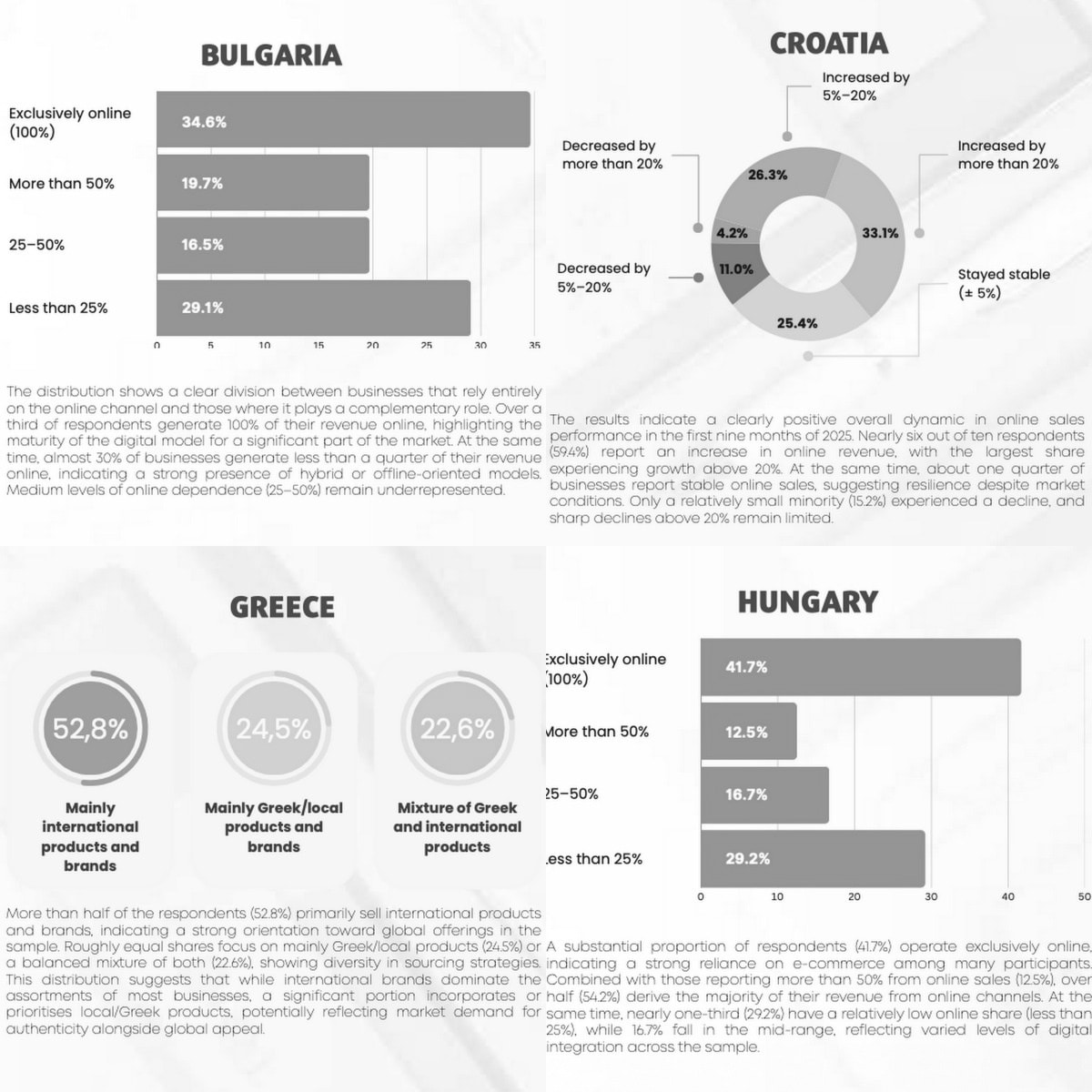 When it comes to cross‑border activity, all five markets remain predominantly domestic. In Greece and Bulgaria, more than 40 percent of respondents do not sell outside their home country, and in Croatia, Romania and Hungary the largest share of merchants either have no foreign customers or less than 10 percent of their customer base is abroad. A smaller group in each country has built a more significant international share, but these are still exceptions rather than the rule. Taken together, the data suggests that cross‑border and regional expansion is more often planned than fully realised. In Hungary and Romania, where overall growth is highest, there is also a relatively larger tier of companies with meaningful international revenue, especially among higher‑turnover brands. In Greece and Bulgaria, where export activity is lower, you also see more companies in the “stable or modest growth” categories. So at the top end of maturity (large, high‑growth brands), exporting and growing tend to co‑exist more often, but we also have strong‑growth companies that are still mostly domestic. Plans for 2026 show that the companies most eager to expand regionally or to broader European markets are usually those that already show stronger growth and higher online dependency. However, many of them still have only small foreign shares today, which suggests that export ambitions follow growth and digital maturity rather than the other way round.